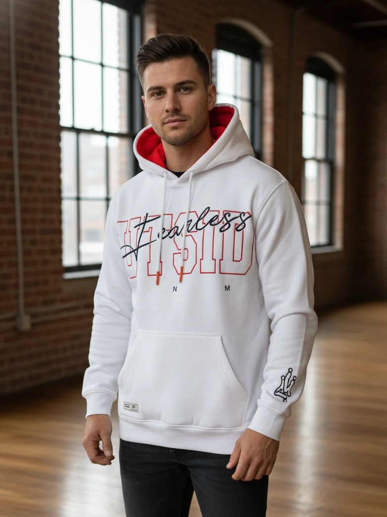 Premium cotton-fleece hoodie with bold “Fearless” graphic detailing, contrast red hood lining, and soft interior comfort — made for confident everyday wear.
