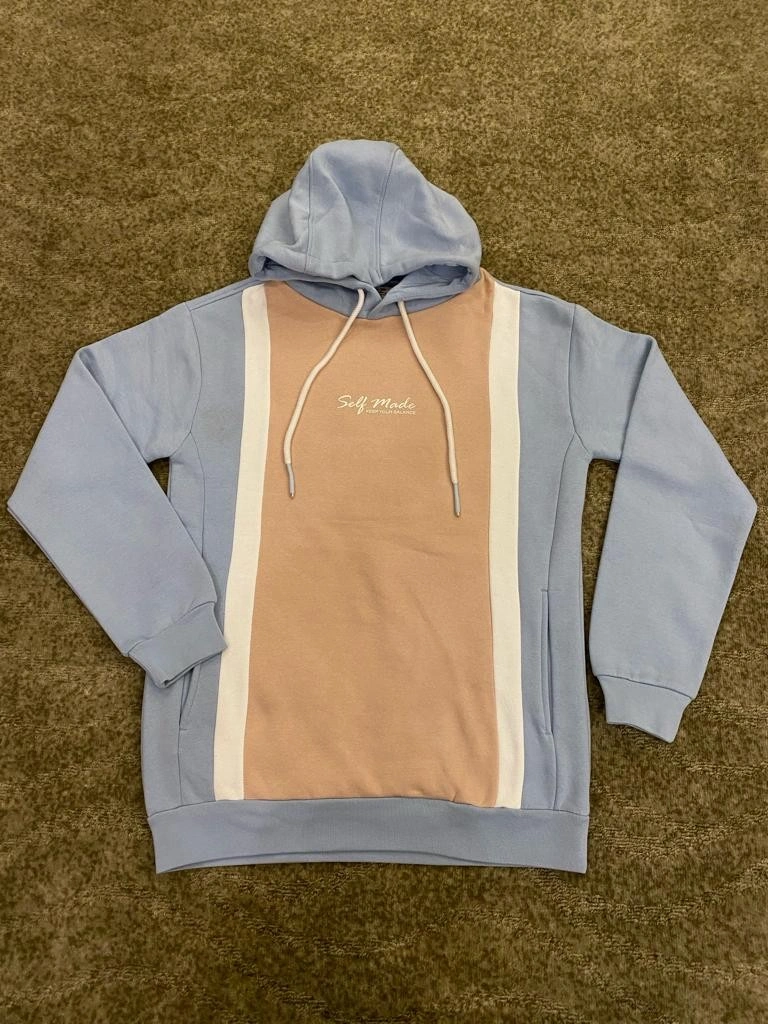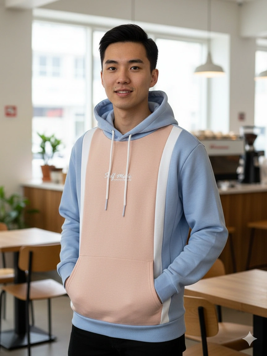 Soft-touch two-tone hoodie in pastel blue and blush peach, offering a relaxed fit with modern color-block design and premium fleece comfort.